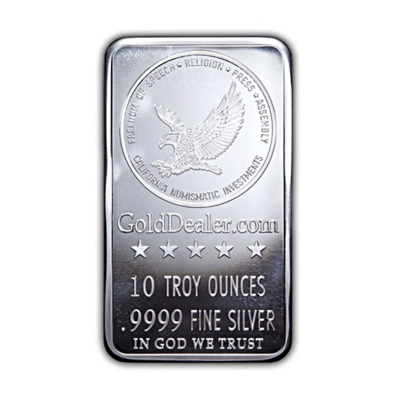 It also comes in a custom soft plastic holder which is excellent for long term storage. The front of this 10 oz silver bar contains these hallmarks in relief: (1) A stylized eagle with the four freedoms spelled out at the top of the bar. Under the eagle is our corporate name – California Numismatic Investments. (2) Under this you will find GoldDealer.com followed by 5 stars in relief. (3) Its weight – 10 TROY OUNCES and purity .9999 FINE SILVER (4) And finally IN GOD WE TRUST.