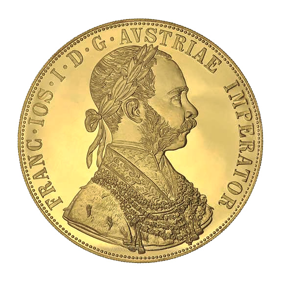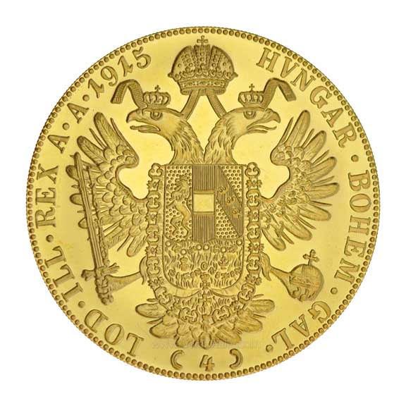 Today’s modern Austrian 4 Ducat Gold Coin follows in the famous steps of the Austrian 100 Corona and Austrian 1 ducat in that those dated 1915 are re-struck. A re-strike is an official reissuing of a coin which is no longer in production. The Austrian 4 Ducat Gold Coin is 0.987 pure (high purity) and its melt weight in gold is 0.4431 troy. So a virtually pure gold coin which contains a little less than 1/2 of an ounce of pure gold which is slightly more than 1 ½ inches in diameter. This makes it larger than its sister bullion coin the Austrian 100 Corona and to attain this size/purity ratio the Austrian Mint makes the 4 ducat thin (about 0.0393 inches). This produces a large coin which does not break the bank but makes a huge bullion statement, and one of the great pure bullion products today. These beauties are large for their weight and the coin’s purity is instantly recognizable as real gold.