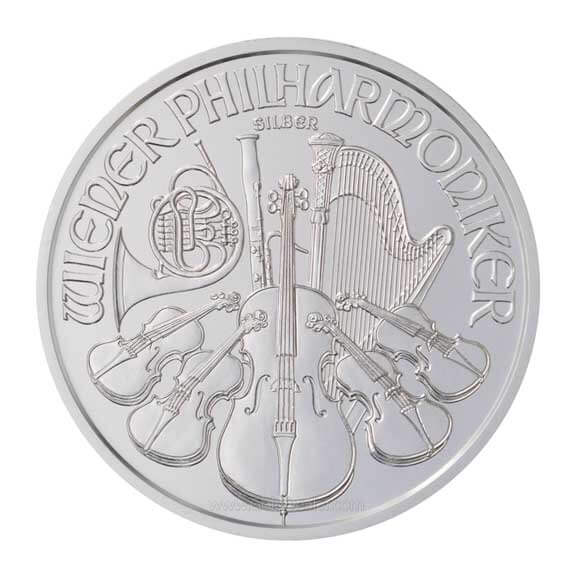 The reverse or back features include an arrangement of musical instruments, the legend “Wiener Philharmoniker” (Vienna Philharmonic) and the word “Silber” (Silver).