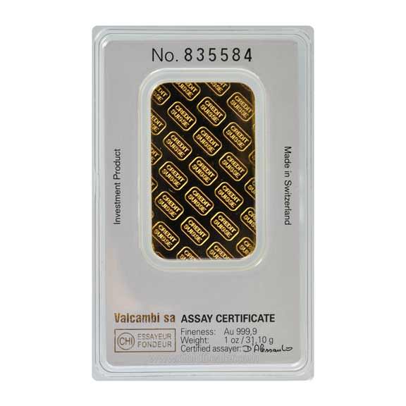 The Credit Suisse Gold Bar 1 oz is difficult to beat for value and liquidity. It features defined edges and brilliant surfaces including a 6 digit serial number on the front of the bar. The back of the packaging repeats the serial number and highlights the manufacturer and provides other technical information. The sealed package makes this an excellent bar for long term storage.