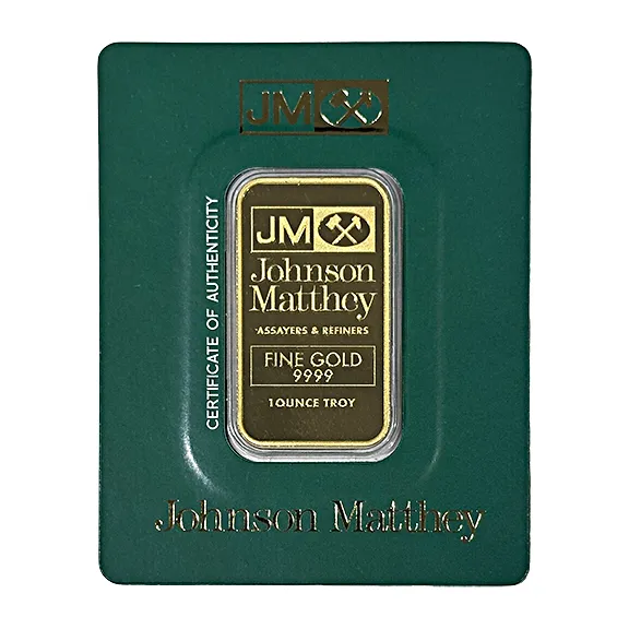 The JM Gold Bar 1 oz is an iconic gold bullion bar which has been actively traded for decades. This brand recognition makes their gold bullion bars a popular choice with investors. The JM Gold Bar 1 oz features a sealed plastic tamper proof holder feauturing a unique 11 digit serial number and stated Certificate of Authenticity. Johnson Matthey is an international banking and services conglomerate with offices all over the world. The bar is produced in Balerna, Switzerland. The trademark has been synonymous with gold bars from 1 oz through kilo size since the early 1970’s, and is immediately tradable by dealers worldwide.