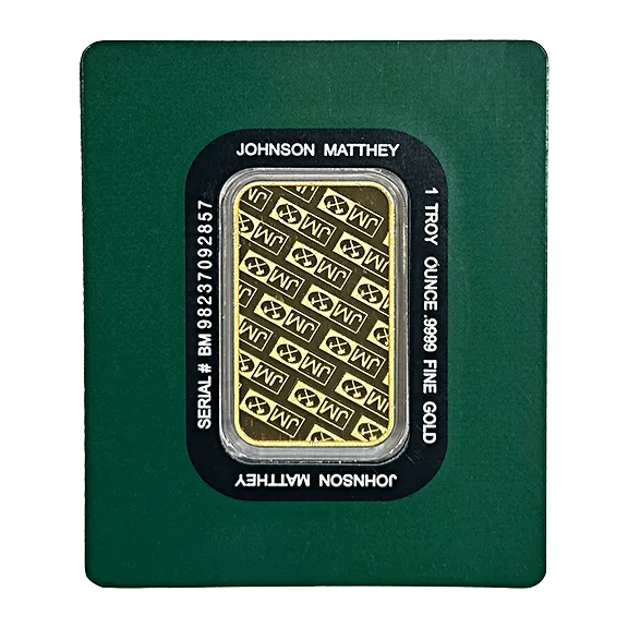 The JM Gold Bar 1 oz is difficult to beat for value, liquidity and safety. It features defined edges, frosted and reflective surfaces on the front and back. The sealed and tamperproof packaging makes this an excellent bar for long term storage. And its 1 oz size makes selling private and easy.