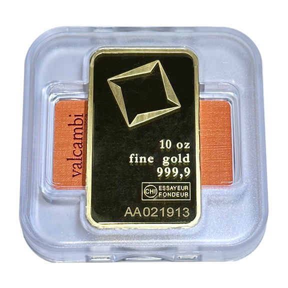 When investing in the precious metals by weight, the Valcambi Suisse Gold Bar 10 oz is difficult to beat for value and liquidity. The 10 oz Gold Bar comes clear plastic case which also displays the orange certificate which can be seen from both sides: the front of the holder features the manufacturer’s name – Valcambi Suisse. The front of the gold bar has rounded corners and a mirror like surface. It features the famous Valcambi Suisse trademark – 10 oz – fine gold – 999,9 – CHI ESSAYEUR FONDEUR and an 8 place unique serial number.